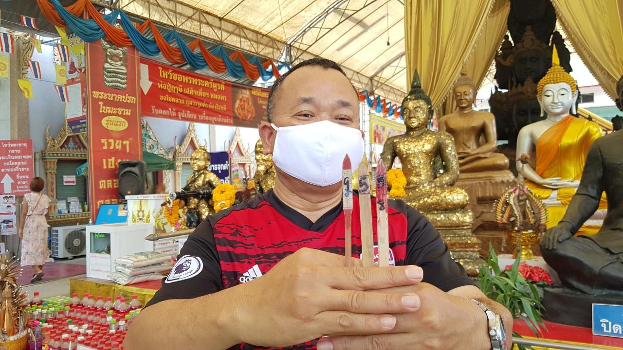 พร้อมกับโชว์เลขไม้เซียมซีที่เขย่า 3 ครั้ง คือเลข 9, 5 และเลข 8 ถือว่าเป็นเลขสวยที่ตนเองก็ชอบ จากนั้นก็เดินไปหาซื้อลอตเตอรี่ตามแผงที่ตั้งขายอยู่ภายในวัด โดยเหมาซื้อเลข 958 และเลขที่เกี่ยวข้องกลับไปมาเหมาหมดกว่า 40 ใบ.