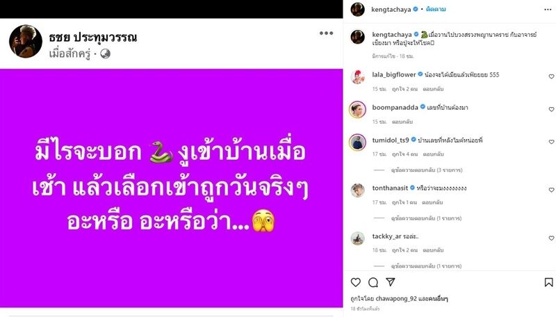 ก่อนวันหวยออก 31 ก.ค.65 เก่ง ธชย อีกหนึ่งสายมูเตลู โพสต์ (รูปงู) เมื่อวานไปบวงสรวงพญานาคราช กับอาจารย์เชียงมา หรือปู่จะให้โชค พร้อมข้อความว่า มีไรจะบอก งูเข้าบ้านเมื่อเช้า แล้วเลือกเข้าถูกวันจริงๆ อะหรือ อะหรือว่า…