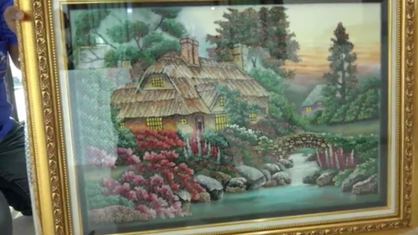 จากนั้น ได้โชว์ภาพที่เพิ่งทำเสร็จจากหินอัญมณีหลายหลากสี เป็นรูปภาพบ้านและสะพานลำธารน้ำล้วนทำจากอัญมณีทั้งหยก ทับทิม บุษราคัม อย่างละเอียด ใช้เวลาทำนานร่วม 3 ปี เมื่อดูใกล้ๆ จะเห็นเม็ดและก้อนอัญมณีที่ใช้แทนสีต่างๆ อย่างชัดเจน ซึ่งภาพที่ทำนี้มีมูลค่าเกินหนึ่งล้านบาทโดยจะนำขึ้นไปเก็บไว้บนบ้านที่สร้างขึ้นเป็นที่อยู่ของสิ่งศักดิ์สิทธิ์ โดยจะทำพิธีบวงสรวงเปิดอย่างเป็นทางการในเร็ววันนี้