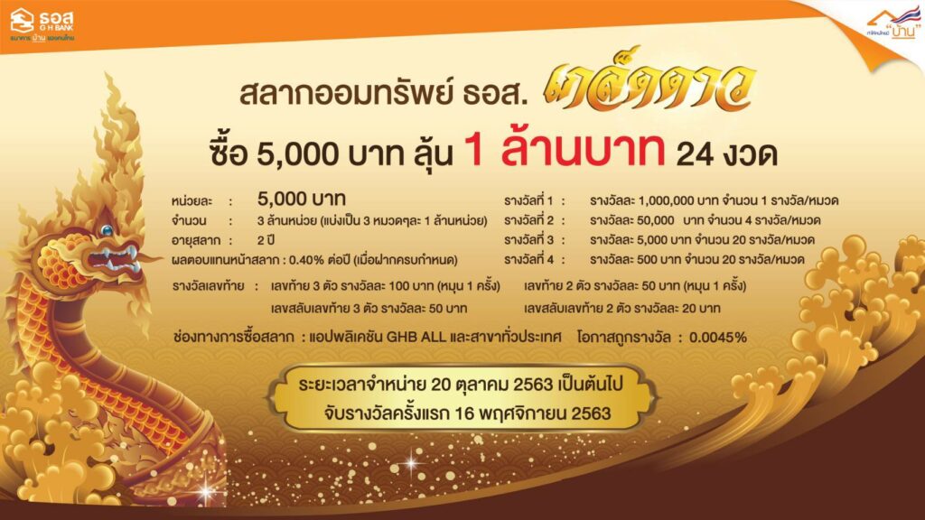 หมวด รางวัลที่ 4 มูลค่ารางวัลละ 500 บาท จำนวน 20 รางวัล/หมวด รางวัลเลขท้าย 3 ตัว รางวัลละ 100 บาท รางวัลเลขสลับเลขท้าย 3 ตัว รางวัลละ 50 บาท รางวัลเลขท้าย 2 ตัว รางวัลละ 50 บาท และรางวัลเลขสลับเลขท้าย 2 ตัว รางวัลละ 20 บาท เริ่มออกรางวัลครั้งแรกวันที่ 16 พฤศจิกายน 2563 สอบถามรายละเอียดหรือติดตามข้อมูลข่าวสารของธนาคารเพิ่มเติมได้ที่ ธอส. ทุกสาขาทั่วประเทศ หรือ ศูนย์ลูกค้าสัมพันธ์ (Call Center) โทร 0-2645-9000 หรือ Facebook Fanpage ธนาคารอาคารสงเคราะห์ และ www.ghbank.co.th